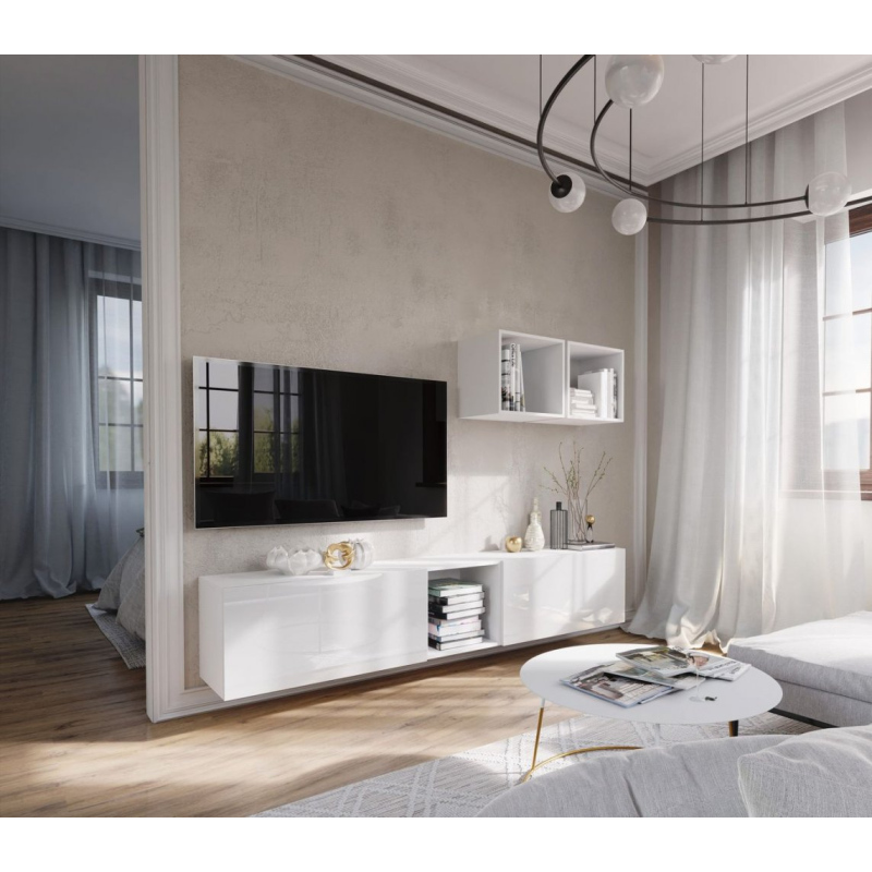 Wohnzimmermöbel Bradt 22 sind ein Set, das ein modernes Interieur ergänzt. Die Wohnwand hat keine herkömmlichen Griffe, sie wurden durch das Öffnungssystem PUSH TO OPEN ersetzt. Sie können die Schränke an der Wand aufhängen oder Beine dazu bestellen und sie auf den Boden stellen.
