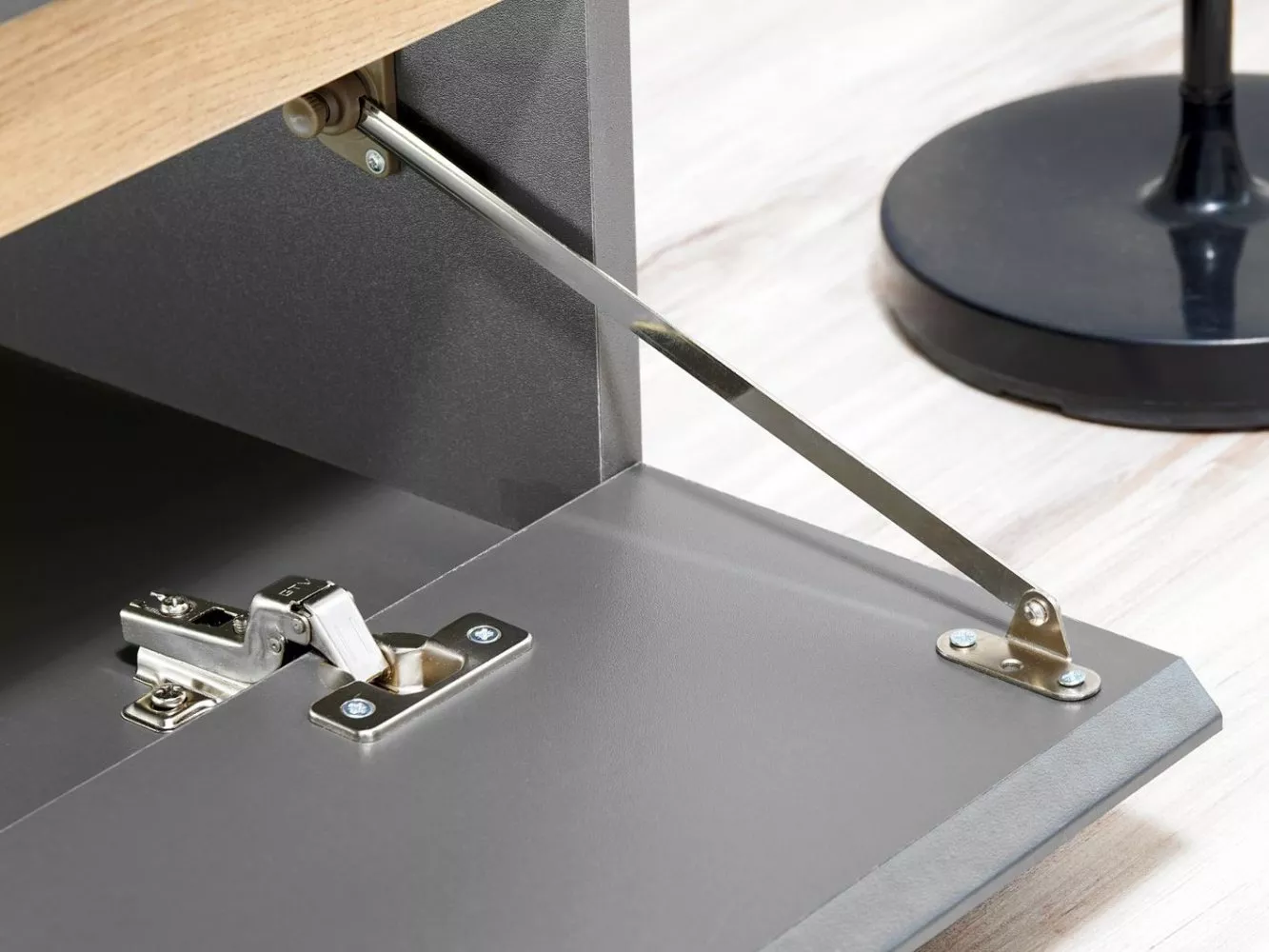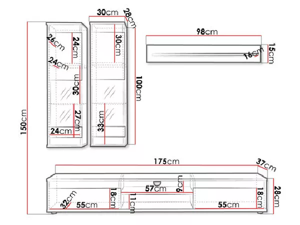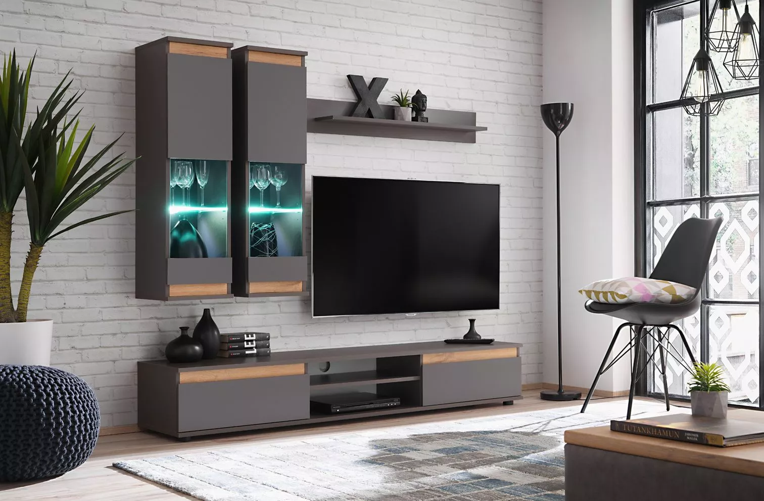 Der moderne Stil der MEDA-Wohnwand belebt das gesamte Wohnzimmer. Der trendige Grauton wird hier mit holzfarbenem Dekor kombiniert und eignet sich ideal für ein modern eingerichtetes Interieur. Neben offenem Platz für TV-Geräte bietet der lange TV-Ständer auch zwei Schränke mit Flügeltüren. Der Innenraum jedes Schranks eignet sich perfekt zum Verstecken von Filmsammlungen, Spielen, CDs oder Kopfhörern. Ein weiteres praktisches Element dieser Wand sind zwei hängende Vitrinen. Dieses harmonische Duo bietet neben Stauraum für Accessoires auch einen Glasteil. Die im Set enthaltene LED-Beleuchtung unterstreicht die Wertigkeit der Dekoration.