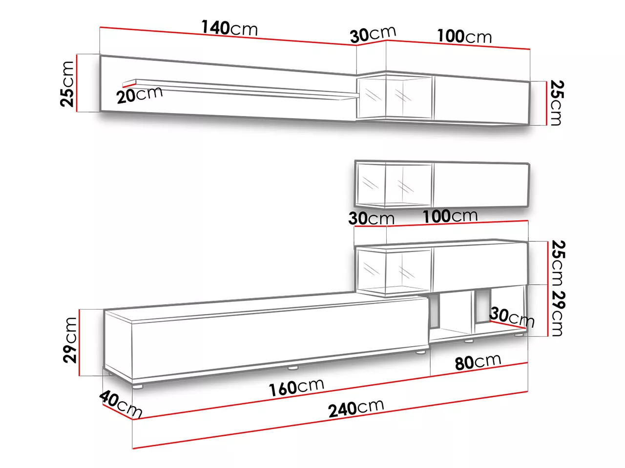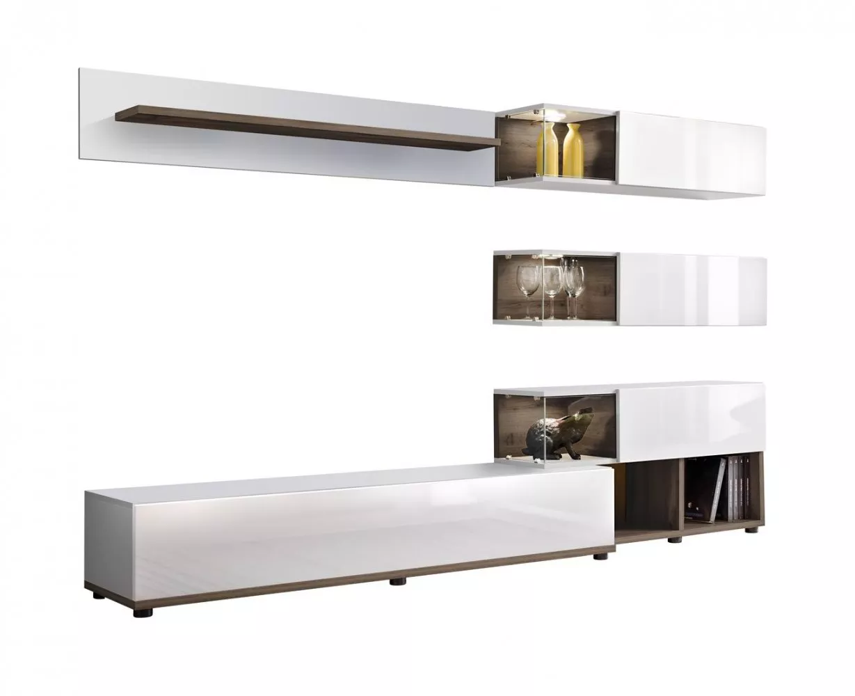 BOHI ist eine hochwertige Wohnzimmerwand in modernem Design. Sie besticht durch ihren unverwechselbaren Look und folgt modernen Trends. Sie umfasst drei Hängevitrinen, die nicht nur ausgewählte Elemente, sondern auch Dekorationen oder Fotos perfekt zur Geltung bringen, sowie einen geräumigen TV-Ständer, der ein idealer Platz für alle elektronischen Geräte ist. Ein kleines Bücherregal für Lieblingsbücher und ein Hängeregal bieten zusätzlichen Stauraum für Dekorationsartikel.